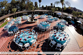Victoria + Adam got married at Rancho Capistrano on September 4, 2010. I loved the color palette Victoria chose. This shade of aqua is one of my favorites, and it really popped with the dark red accents. You can see more of their gorgeous photos at photographer Rustin Michael's website.